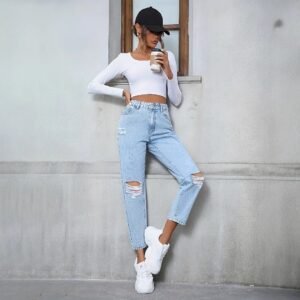 Women’s Casual Loose Straight Ripped Denim Trousers