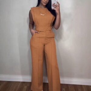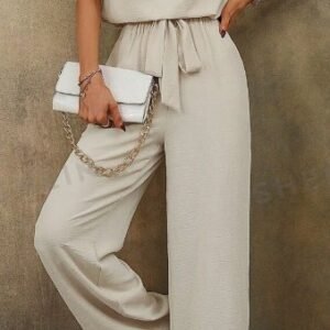 Women Solid Color Sleeveless Top With Notch Neckline And Belted Long Pants Set