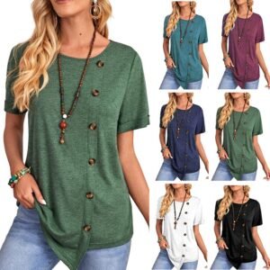 Round Neck Button Irregular Hem Short Sleeve T-shirt