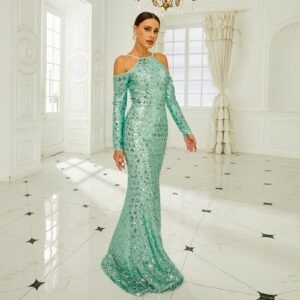 Long Sleeve Round Neck Sequins Banquet Fishtail Evening Dress