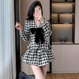New Bow Long Sleeve Edging Top Skirt Plaid Two piece Set