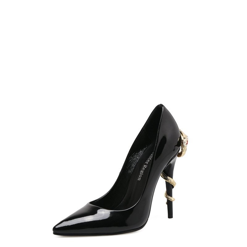 Step into sophistication with our Cobra Heel Pointed Low-Cut Patent Leather High Heels. Featuring a unique cobra-shaped heel, sleek pointed toe, and glossy patent leather finish, these shoes are a perfect blend of elegance and bold style. The low-cut design elongates your legs, making them ideal for formal events, evening parties, and fashionable streetwear looks.