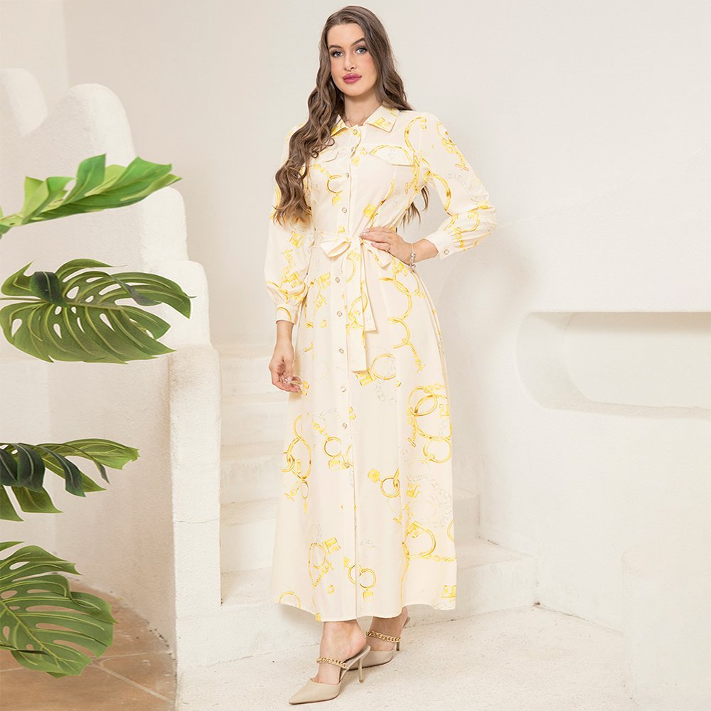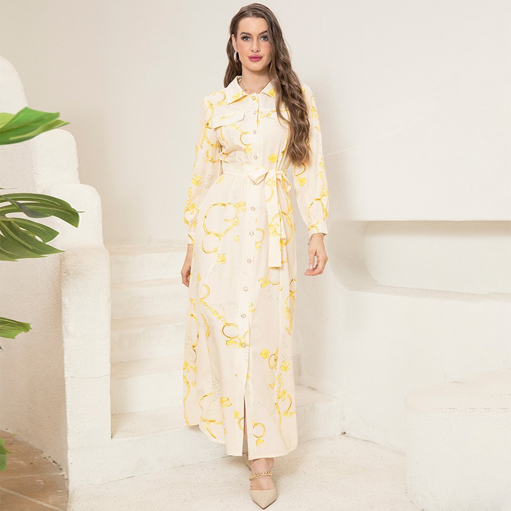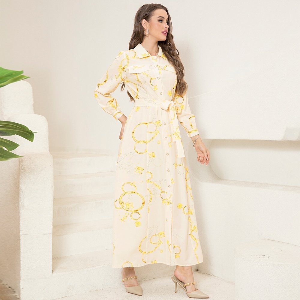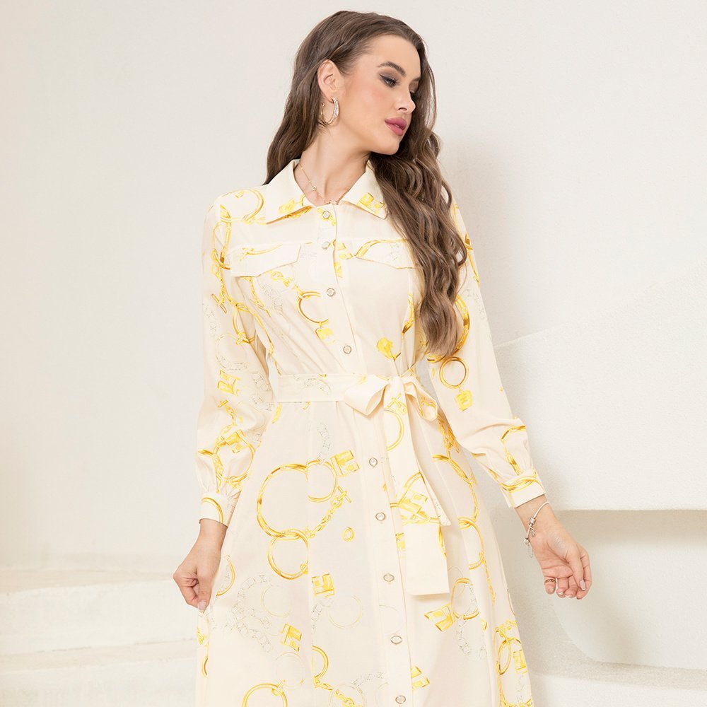 Elegant and stylish, this long shirt dress is perfect for parties and upscale gatherings. Designed with a classic turn-down collar and striking chain print, it features shirt-style sleeves, decorative buttons, functional pockets, and a matching belt that enhances the high waistline for a flattering silhouette.