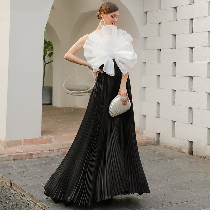 Made from premium, breathable fabric, it offers both comfort and style, making it ideal for evening parties, formal events, or special occasions. The black and white color combination creates a chic and versatile look, while the handcrafted flower hem adds a delicate, feminine touch.