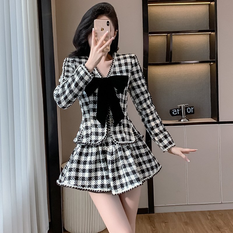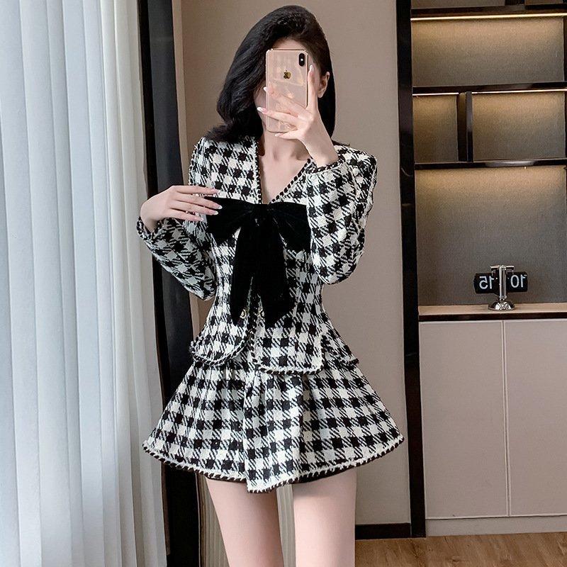 Name: New Bow Long Sleeve Edging Top Skirt Plaid Two piece Set