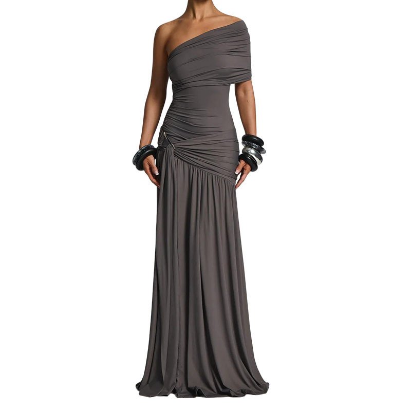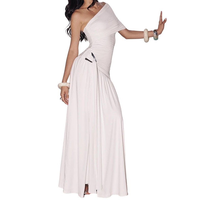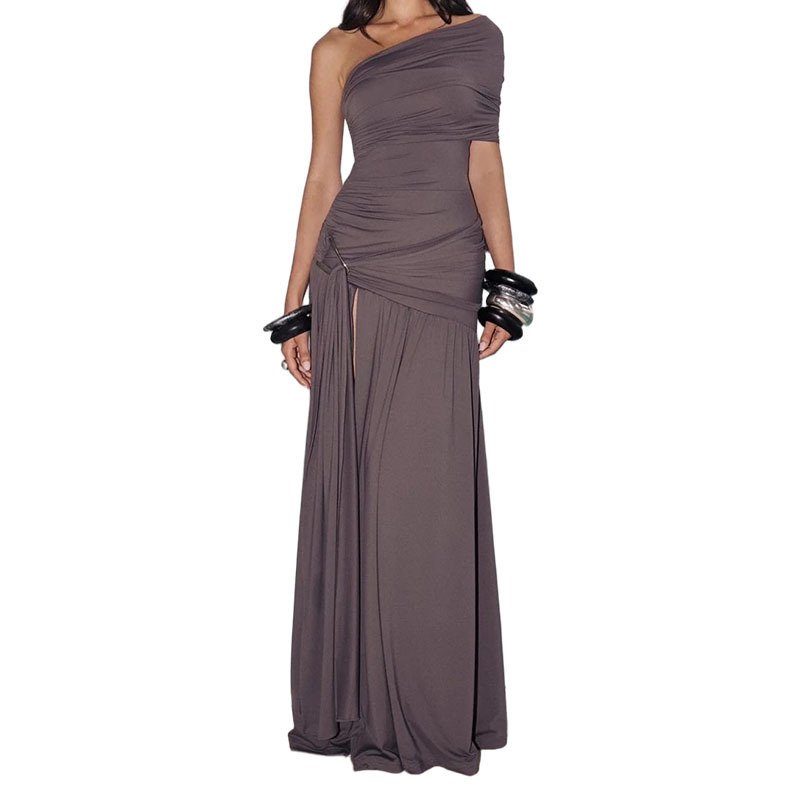 Embrace refined elegance with the Solid Color Pleated One Shoulder Long Dress – Split Girdle Waist Maxi for Women. This stunning gown features a diagonal neckline that adds a modern twist to timeless sophistication. The pleated detailing and waist-cinching girdle accentuate your figure beautifully, while the side split adds just the right touch of allure. Perfect for evening events, formal parties, or special occasions, this dress blends confidence, style, and grace effortlessly.