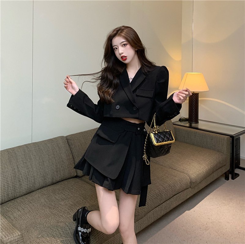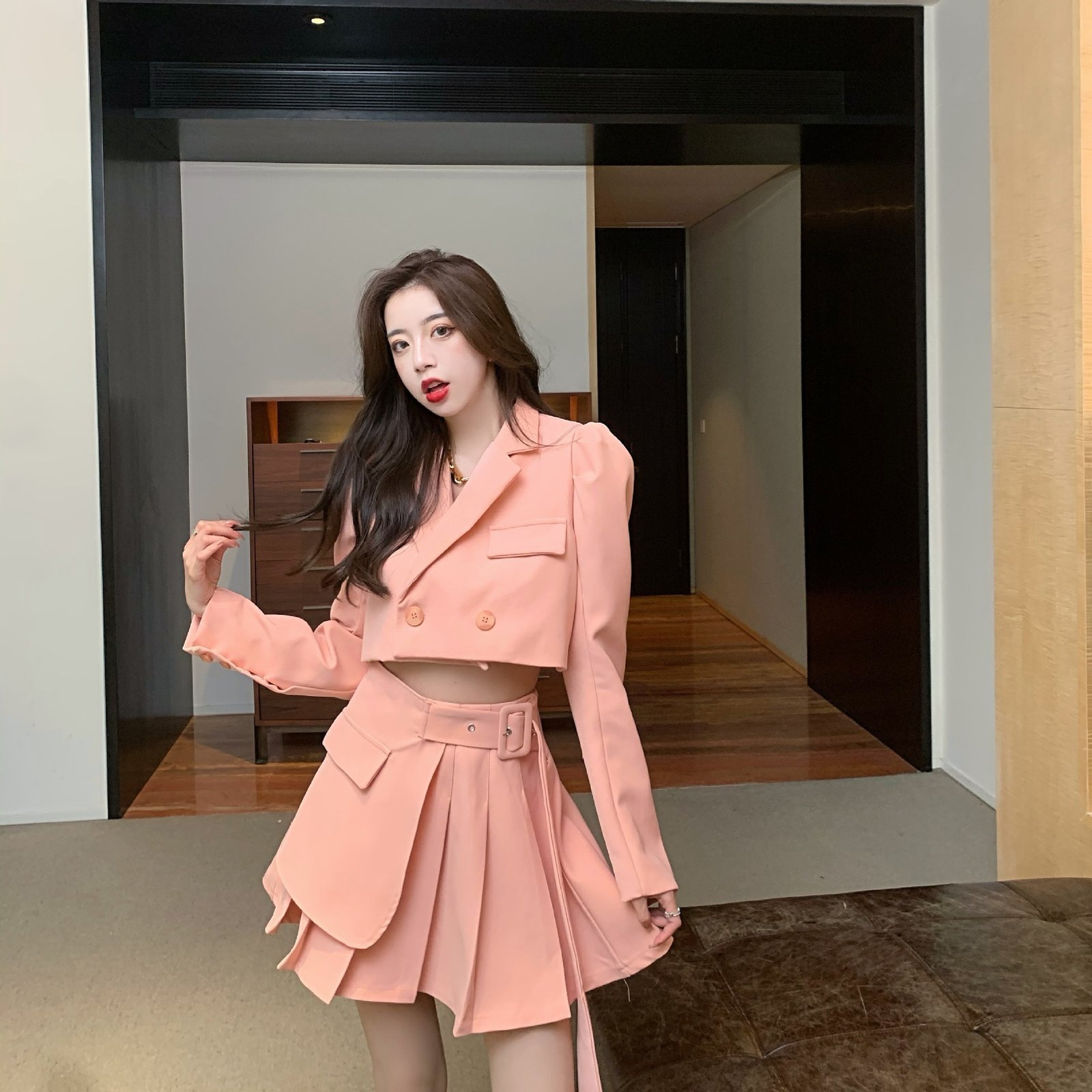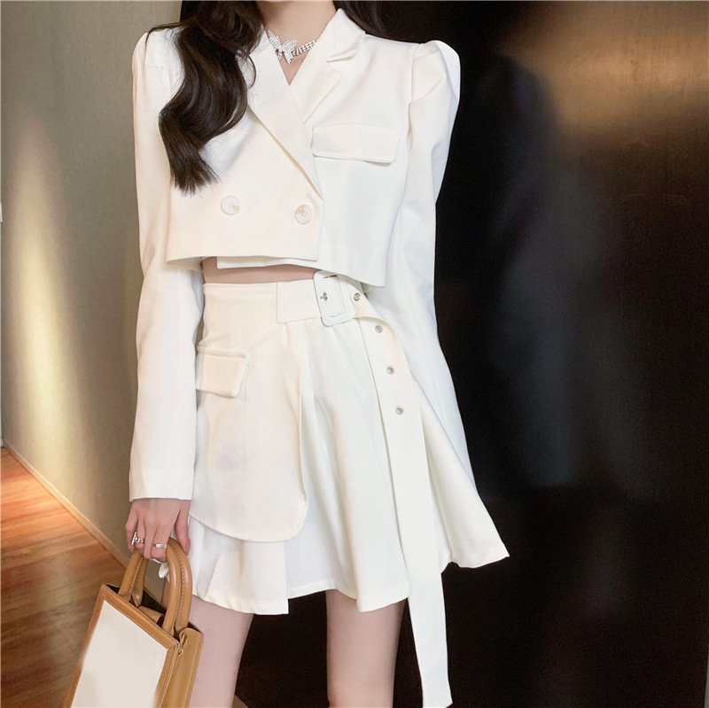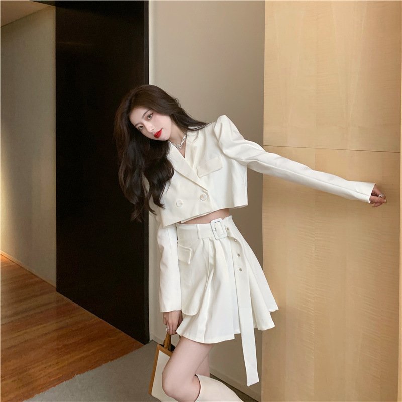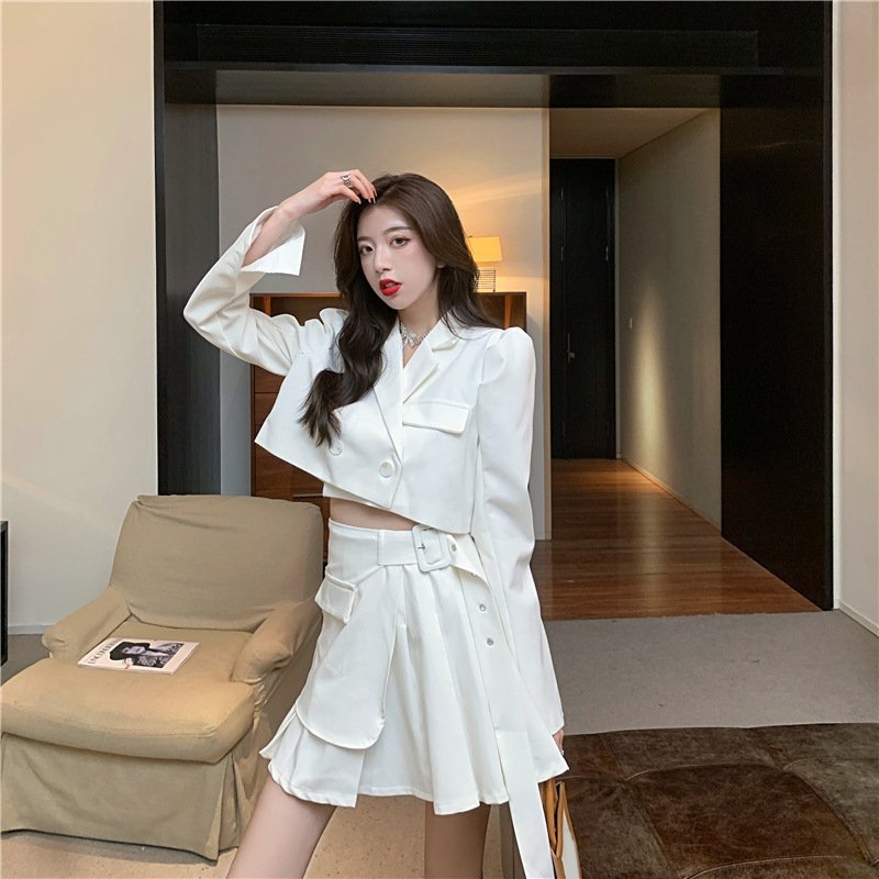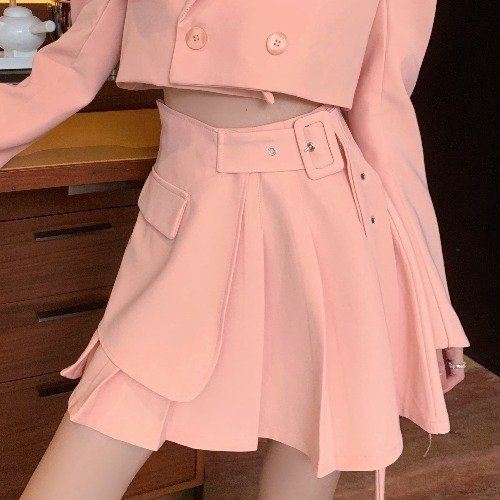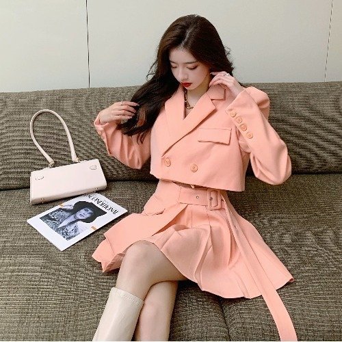 Color: pink top, white suit, pink suit, black suit, pink skirt, black top, white top, white skirt, black skirt